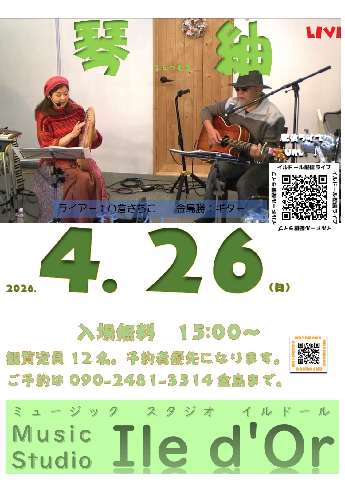 次回の配信ライブは 「琴紬」 2026年4月26日(日)15時からを予定してます。 配信ライブURL… https://www.youtube.com/@iledor6209/streams 生ライブがご覧になれます(12名程度)。観覧無料ですがご予約の方優先です。 イルドール金島 090-2481-3514 (本番15分前までにご連絡ください) 場所 スタジオイルドール (←クリック)